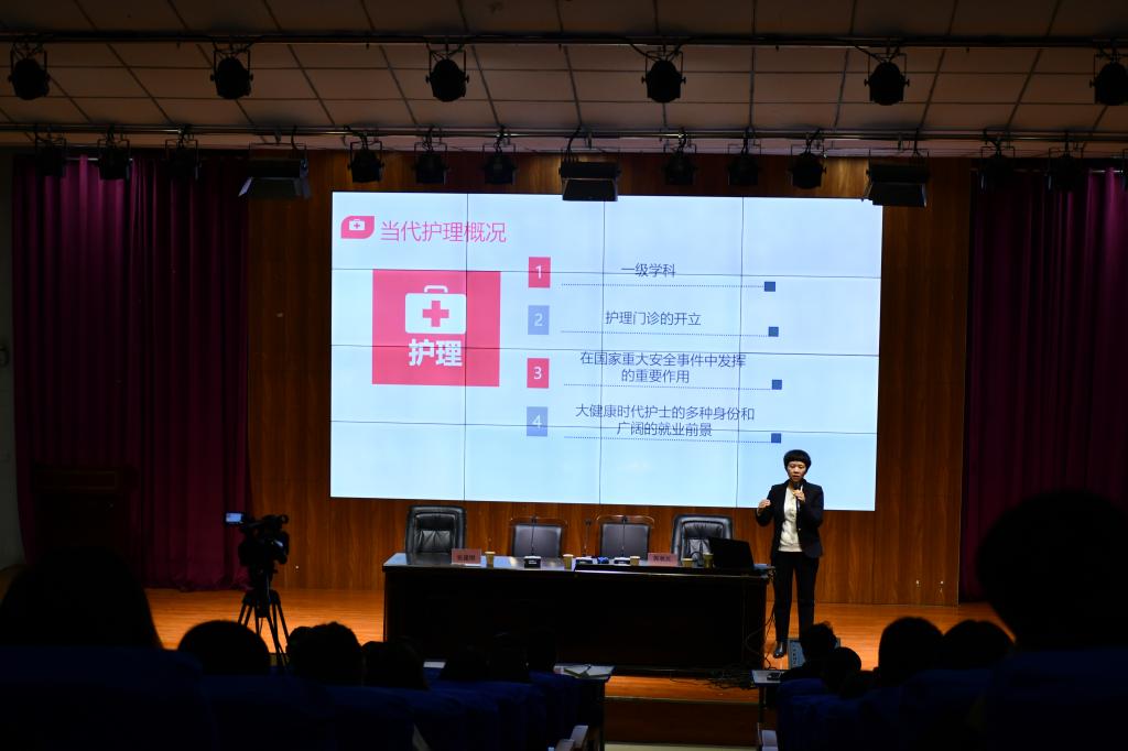 下午,周口市中医院护士长郭秋红围绕“如何做一名优秀的护理工作者”,从一级学科、护理门诊的开立,护理在国家重大安全事件中发挥的重要作用,以及大健康时代护士的多种身份、广阔的就业前景四个方面,为同学们介绍了优秀护士必备素养和职业生涯规划。