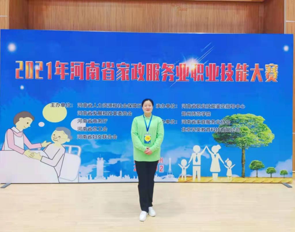 2021年度河南省家政服务业职业技能大赛于12月6日在郑州圆满落幕。太阳成集团tyc151cc教师位东丽在赛场不畏强手、顽强拼搏,完美的展示了良好的精神风貌和专业素养,荣获大赛一等奖。
