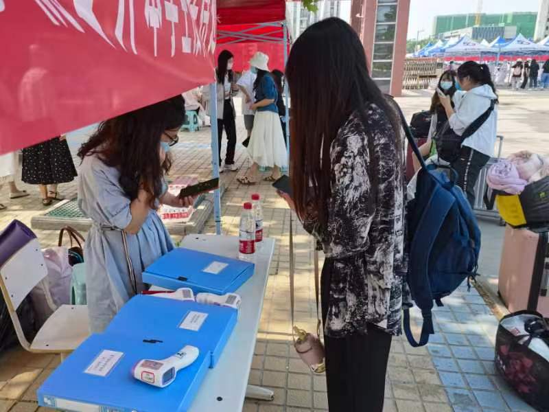 面对疫情防控严峻形式,公司党总支书记于爱霞、经理付晓东带领辅导员工作在迎接员工返校第一线,支帐篷、配消杀、部岗位、明流程,确保按照疫情防控要求,考生能够快速有序入校。全体辅导员顶着炎炎烈日进行体温测量、健康码查验、返校登记、核酸检测等工作,报到现场井然有序,工作流程严谨细致,严格按照疫情防控闭环管理要求进行,保障考生顺利参加考试。