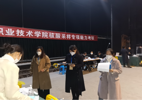 为了顺利完成本次考核工作,太阳成集团tyc151cc选派10名具有核酸采样职业技能鉴定资质的教师担任考评员,经过全方位培训,迅速组建考评员队伍。考核中,评审小组按照相关评分标准,从操作前准备、防护服穿脱流程、咽拭子采集、标本保存与送检、消毒流程、医疗废物处置规范等方面进行量化评分。并对参考人员出现的不规范的手法、站位、消毒、注意事项等进行现场指导、点评和纠正,进一步规范了采样人员操作,加强核酸采样质量,确保了鉴定考试工作的有序开展。经过两天紧张工作,顺利完成800名参考人员的考评工作。