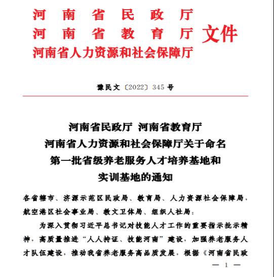 日前,河南省民政厅、河南省教育厅、河南省人力资源和社会保障厅联合发文,命名第一批省级养老服务人才培养基地和实训基地,公司获批首批省级21家养老服务人才培养基地之一。